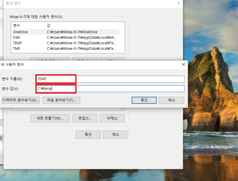 변수값은 'C:\temp' 로 지정해 줍니다.