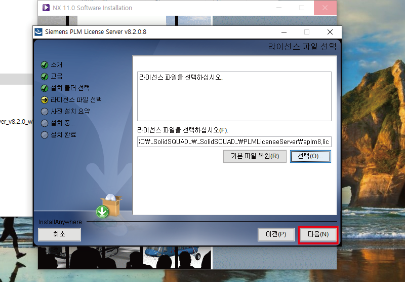 라이센스 파일을 잘 선택했는지 확인후