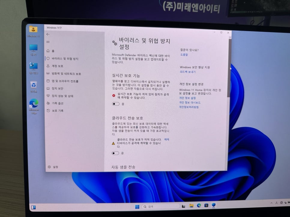 5분정도 지나면 윈도우 디펜더가 다시켜집니다.