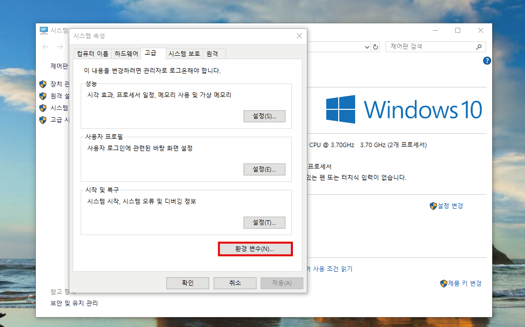환경변수 탭을 클릭합니다.