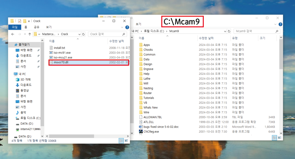 'msvcr70.dll' 파일을 C 드라이브내의 Mcam9 폴더로