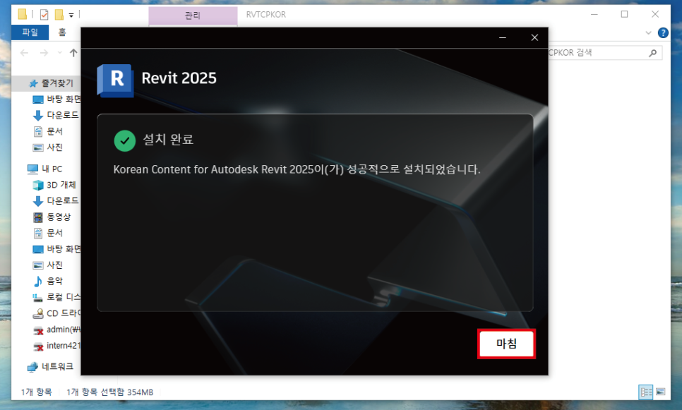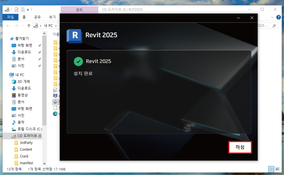 설치가 마무리 되면, "마침" 버튼을 클릭합니다.