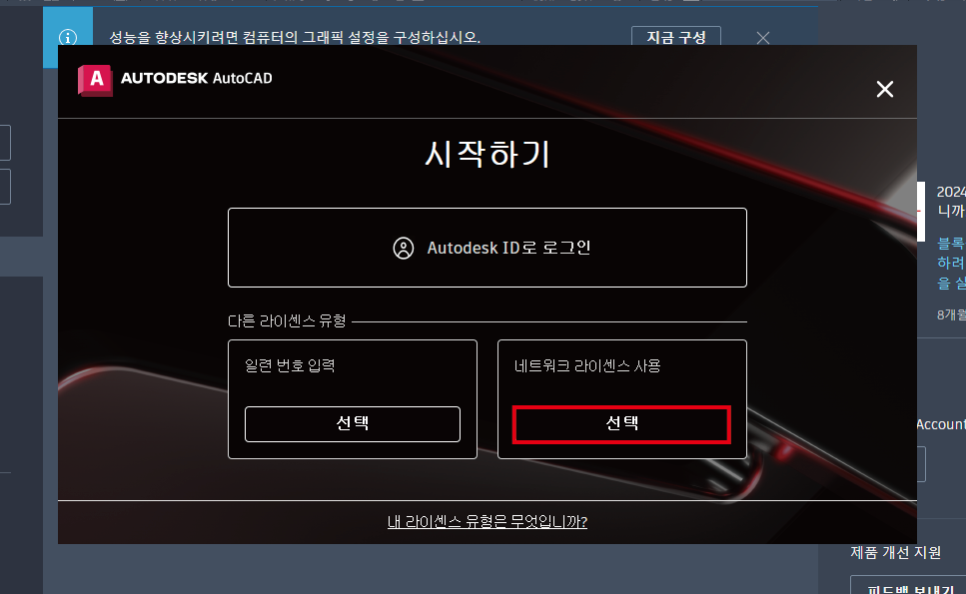 캐드를 실행하면 라이센스 유형이 뜹니다.