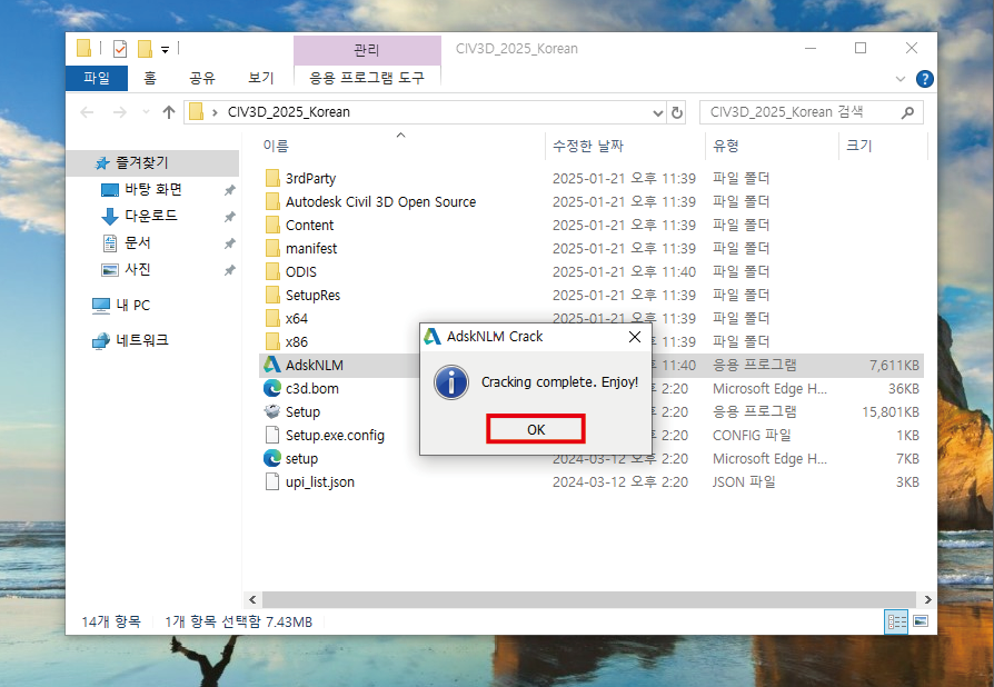 Civil 3D 폴더내의 "AdskNLM" 파일을