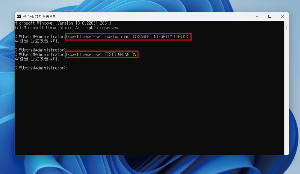 이 작업은 항상 드라이버 서명모드 미적용으로