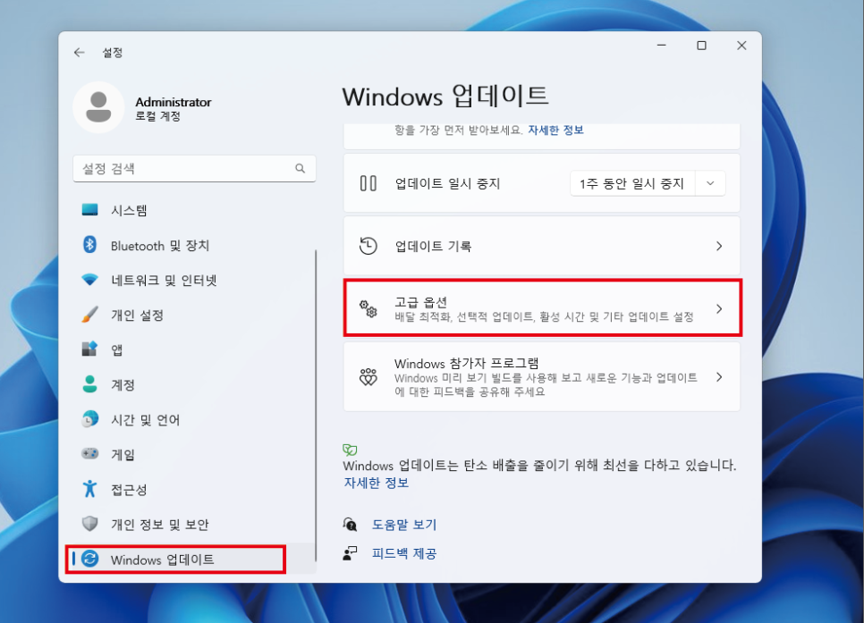 "Windows 업데이트" 클릭후,