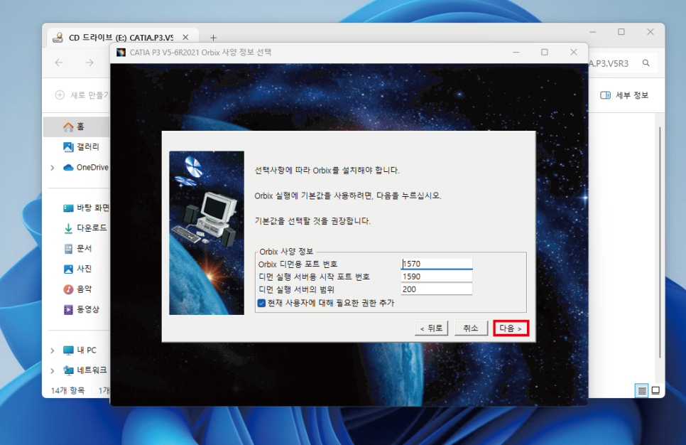 초기 설치 단계에서는 계속 "다음" 을