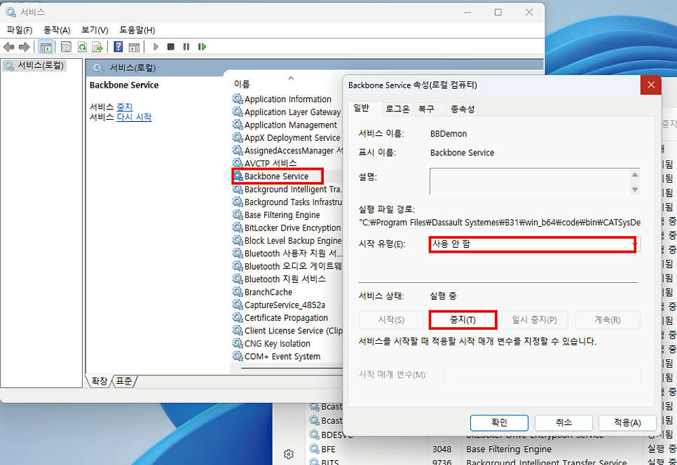 이렇게 하면 백본서비스가 중지됩니다.