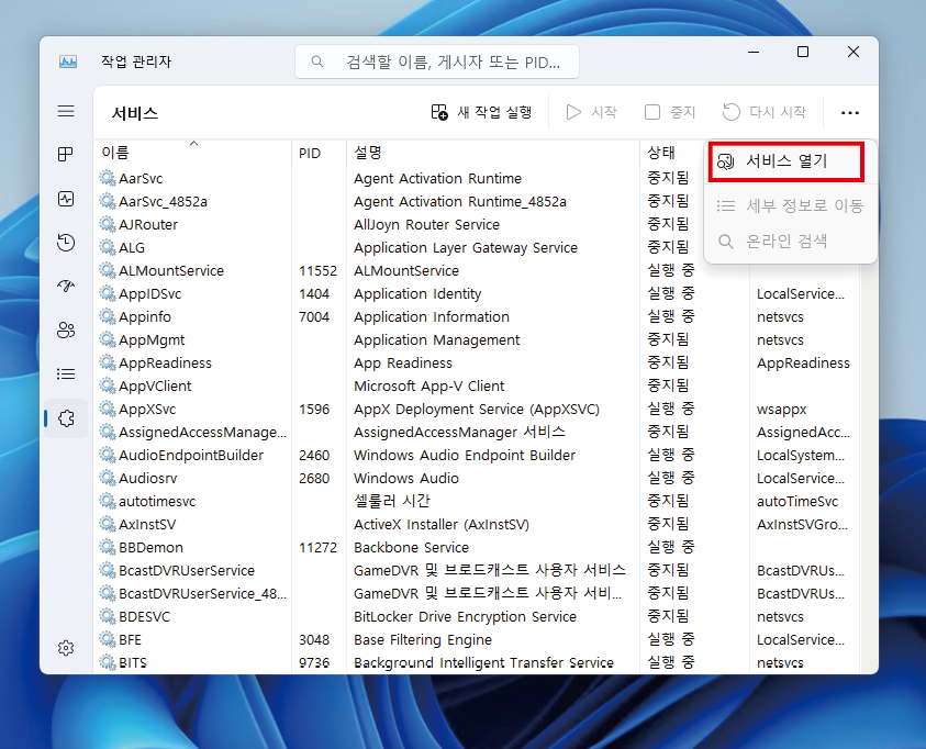작업 관리자 실행후, 서비스탭을 클릭합니다.