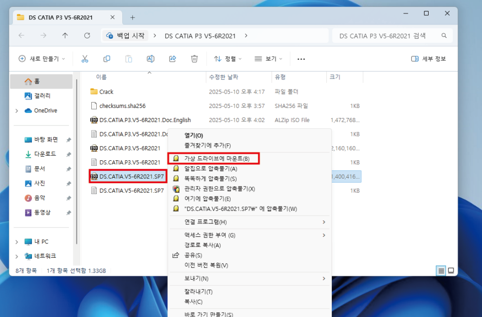 서비스팩 파일을 "가상드라이브에마운트" 시켜 줍니다.