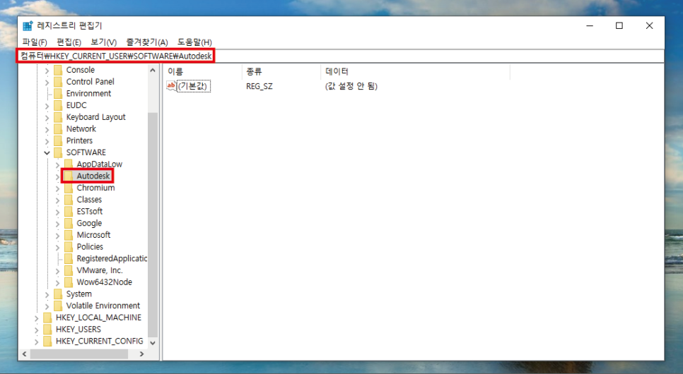 Autodesk 키를 삭제 합니다.